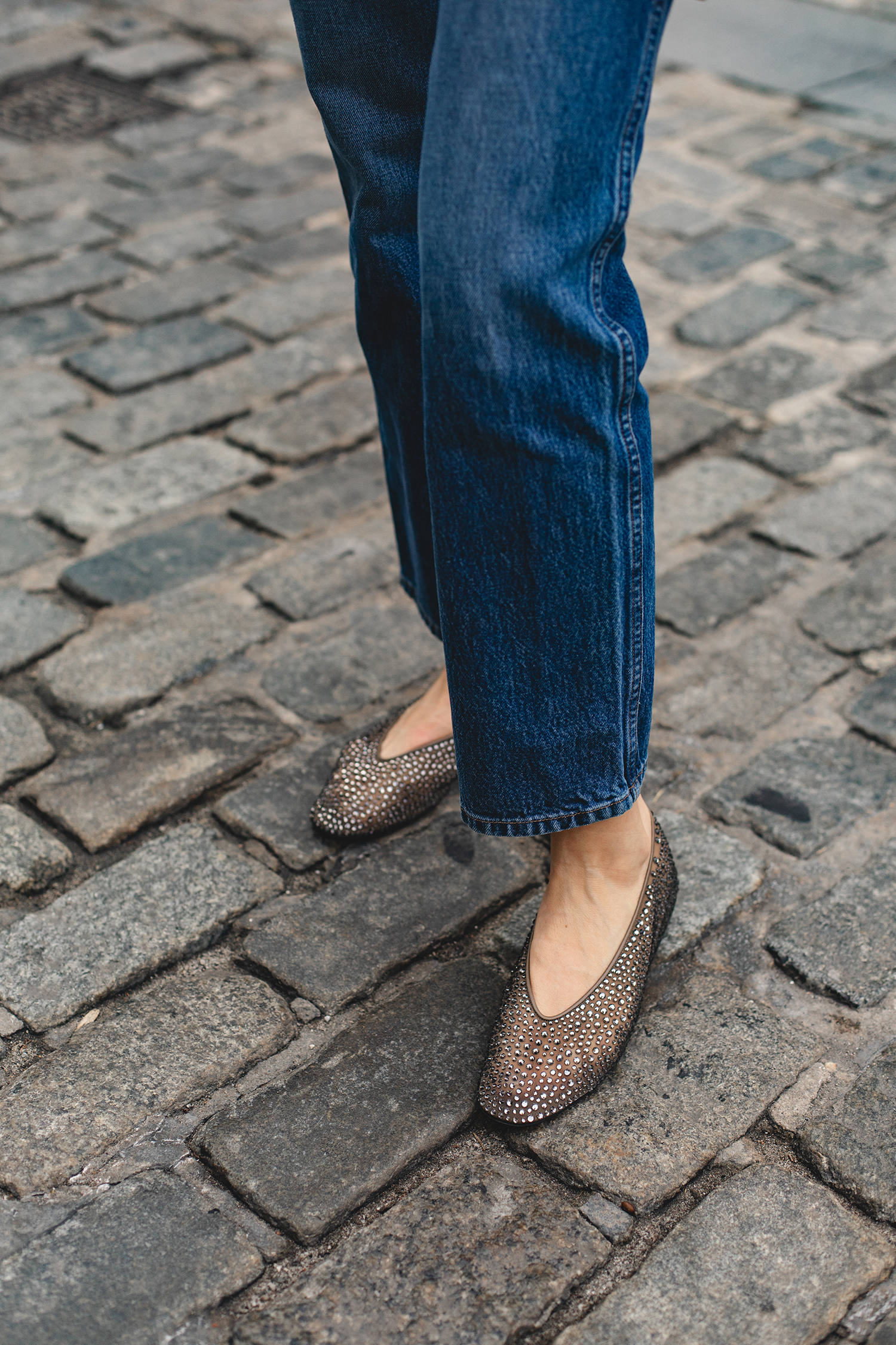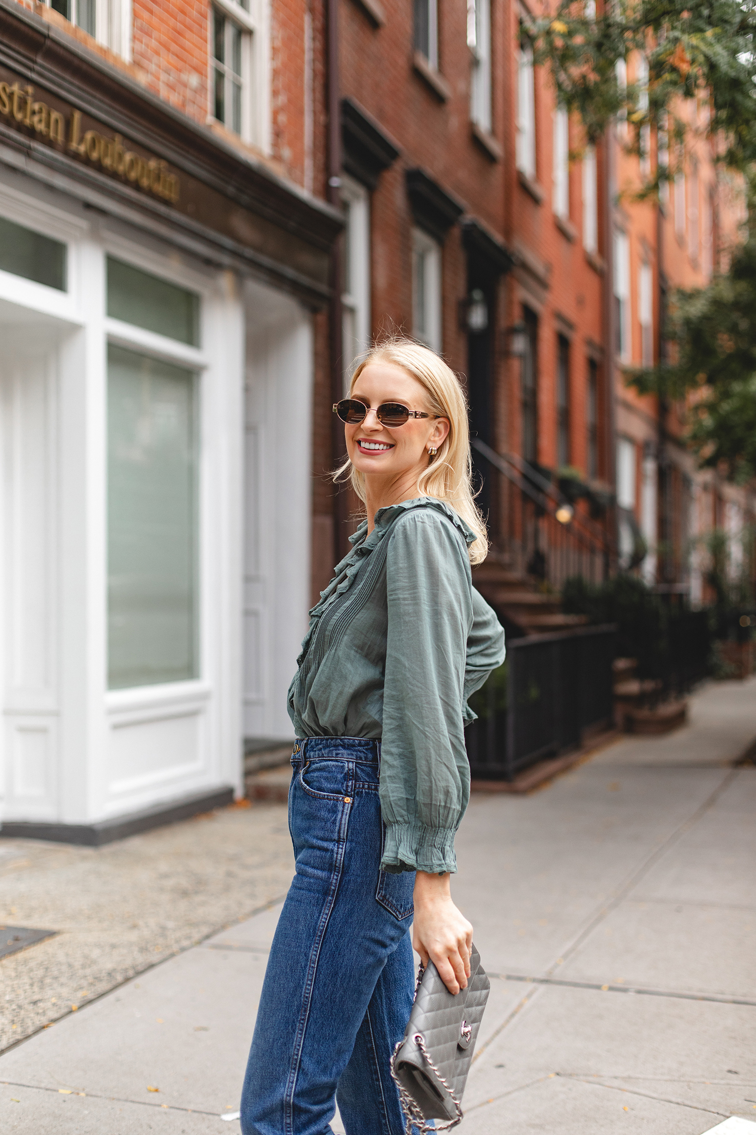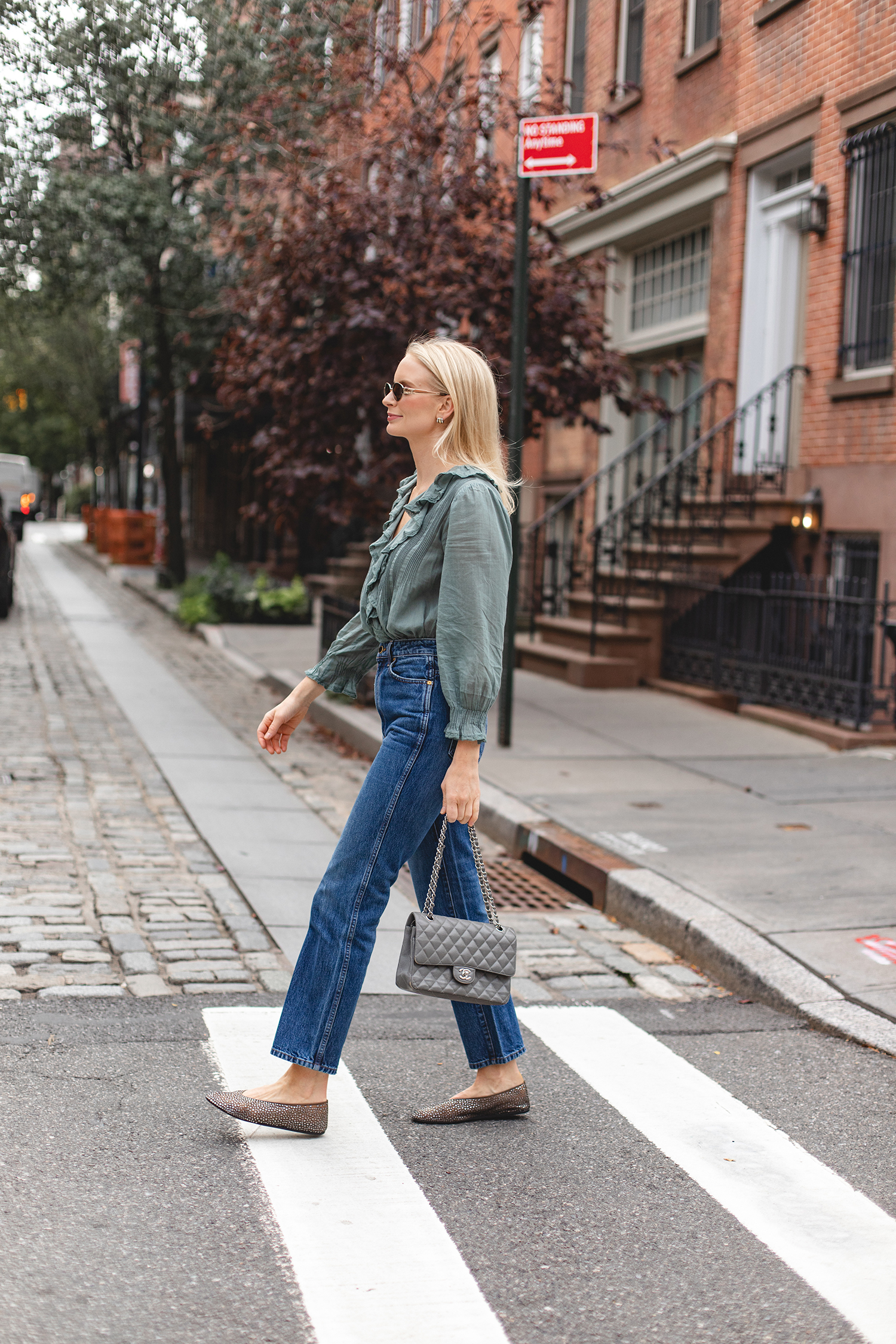I wore this look for my first full day back in the city two weeks ago, and received so many compliments! This top is such a striking shade of blue that feels both fresh and timeless at once. The color is very transitional too – it would look amazing with white denim in the summer, but feels rich and jewel-toned enough for the fall season too! Plus, with the breezy, lightweight fabric makes it a no-brainer for these first weeks (and months) of fall – especially if you live somewhere hot like Texas! These embellished flats also got a lot of commotion, and for good reason… they are FABULOUS! And actually very comfortable. Win win!