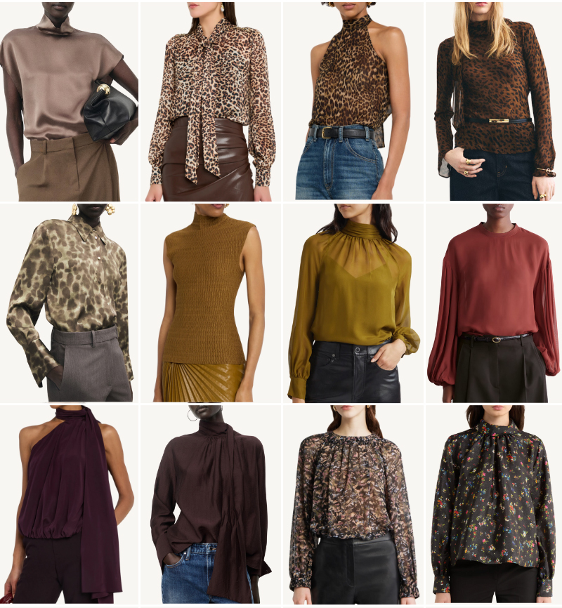 MIDDLE ROW: PRINTED BUTTON-DOWN // BRONZE MOCK-NECK TOP // OCHRE HIGH-NECK SHEER BLOUSE // DARK RED SHEER BLOUSE