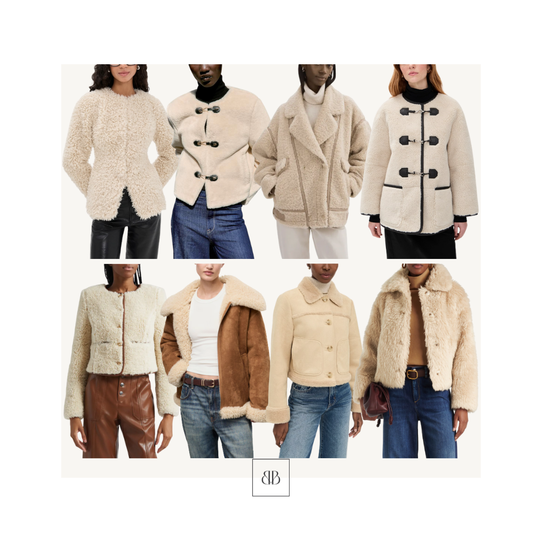 I love how this particular jacket features glam gold buttons and a black faux leather trim – elegant details that give this piece a polished touch. If you’re interesting in a faux shearling jacket like this, shop even more chic styles below! If I were to pick one, this would be my rec – it’s currently on sale for under $50!!!