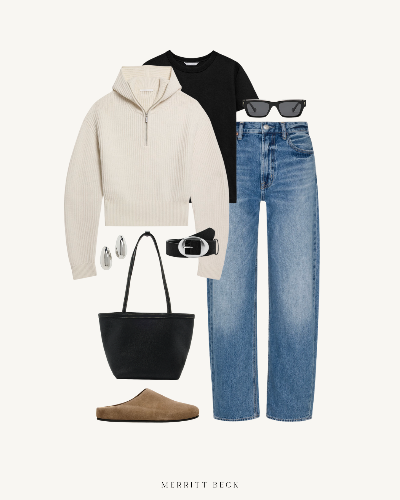 HALF-ZIP SWEATER // TEE // JEANS // TOTE // MULES // SUNGLASSES // EARRINGS // BELT